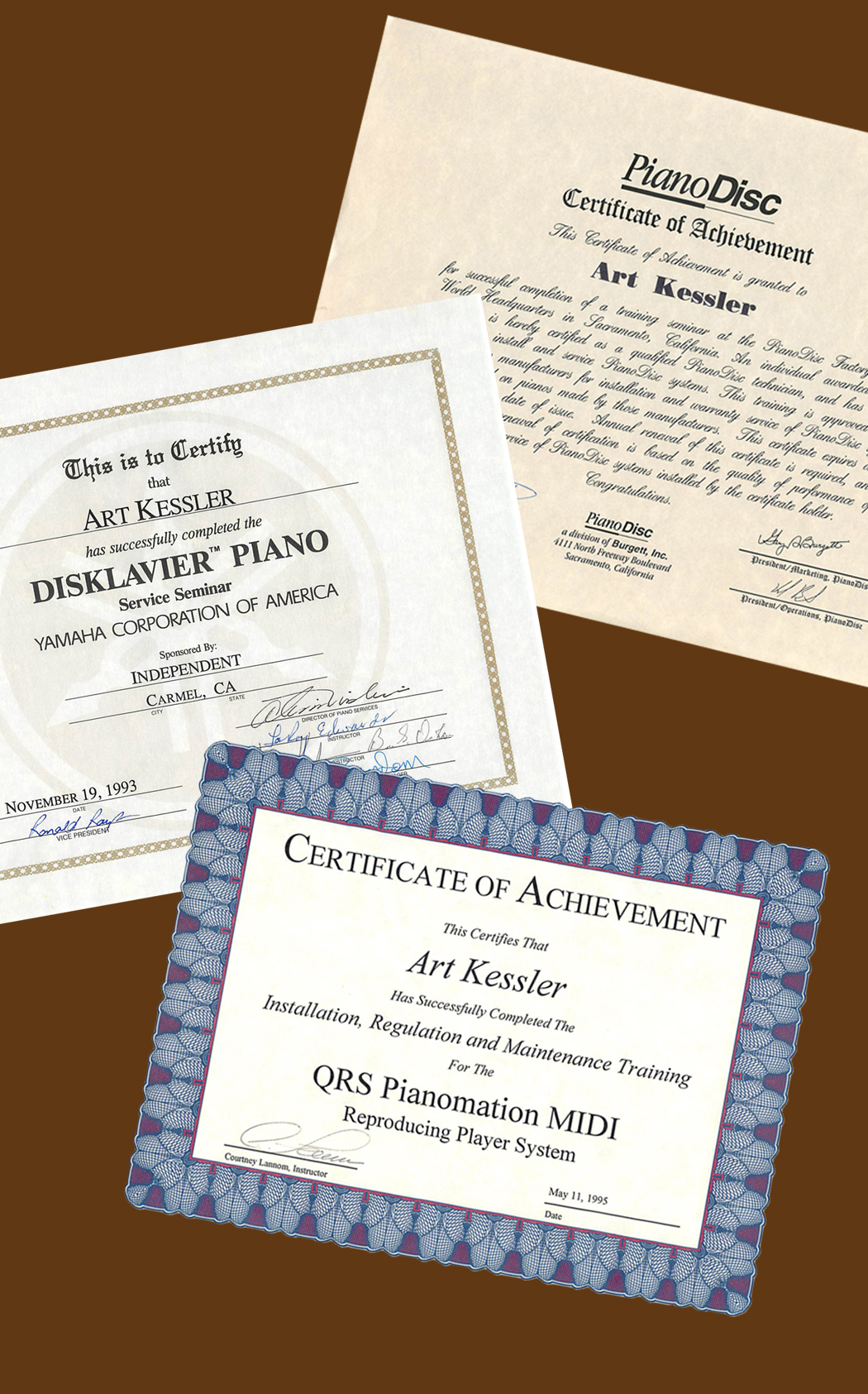 Playback systems for acoustic pianos have come a long way since the pneumatic systems that reached the height of their popularity in the early 1900s. Today's modern recording and playback systems make use of sophisticated computer control systems, fiber-optic cabling, solenoid-driven keys and pedals, and compact disk and mobile device-based playback and recording media. Servicing these systems requires almost as much understanding of electronic control systems as it does of acoustic piano technology. I have studied and received training on these systems from three manufacturers: Yamaha Corporation and their Disklavier systems, Music Systems Research and their PianoDisc systems, and QRS and their Pianomation systems.
