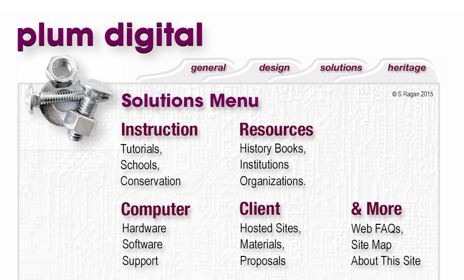 For those who have been here a lot, this section is new. It replaces the Technical Section and incorporates things that were elsewhere on the site. It incorporates the Services: Design, Training and Consulting, with Client materials. Plum Digital Data Sheets. Basic information is in General. Check the Doorway or Site Map for other links. Webmaster: webmaster @ www.plumdigital.com. Thanks. RETURN TO Plum Digital Doorway